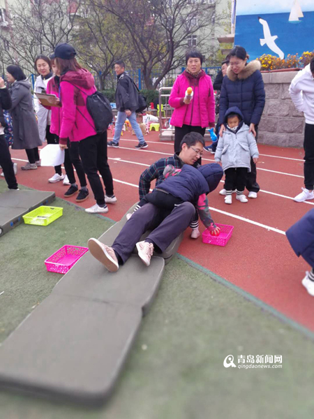 這是一項考驗體力與耐心的運動,家長和孩子們同時從起點出發(fā)爬過墊子,孩子們拿起筐里的軟壘球,放入筐中,要放滿5個,用時最短的獲勝。