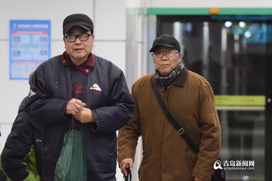 開(kāi)通首日的乘客中不乏年事已高的老年人身影,還有從青島市區(qū)坐公交,專(zhuān)門(mén)來(lái)感受13號(hào)線(xiàn)的耄耋老人,80歲的邵吉堂(右)就是其中之一。