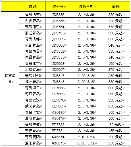 1月29日,從海南航空商委青島營(yíng)業(yè)部獲悉,為了滿足春運(yùn)大量旅客的出行需求。海南航空商委聯(lián)合旗下航空公司海南航空、首都航空、天津航空、祥鵬航空、北部灣航空近期在青島=西安、麗江、成都、南昌、???、北京、武漢、鄭州、淮安、寧波、襄陽等多條航線推出特價(jià)機(jī)票,部分特價(jià)機(jī)票為1至3折。