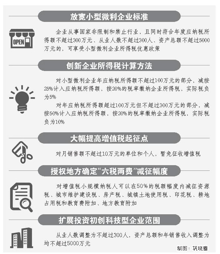 創(chuàng)新企業(yè)所得稅計算方法,加大企業(yè)所得稅優(yōu)惠力度。此次政策調整,引入企業(yè)所得稅超額累進計算方法,對小型微利企業(yè)年應納稅所得額不超過100萬元的部分,減按25%計入應納稅所得額,按20%的稅率繳納企業(yè)所得稅,實際稅負為5%;對年應納稅所得額超過100萬元但不超過300萬元的部分,減按50%計入應納稅所得額,按20%的稅率繳納企業(yè)所得稅,實際稅負為10%。政策調整后,小微企業(yè)企業(yè)所得稅整體稅負降幅在50%以上,優(yōu)惠力度不斷加碼。