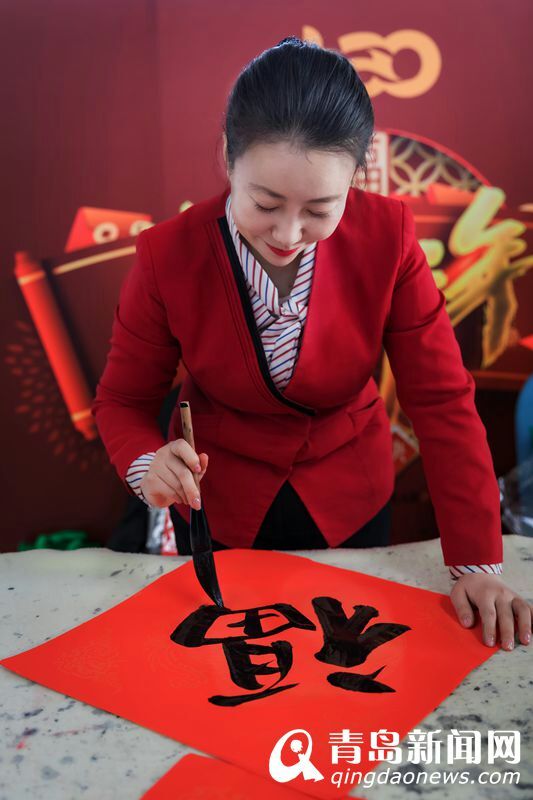 機場職工現(xiàn)場寫福字。(苗瑋攝)