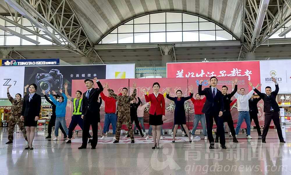 青島機場上演春運歌舞秀。(苗瑋攝)