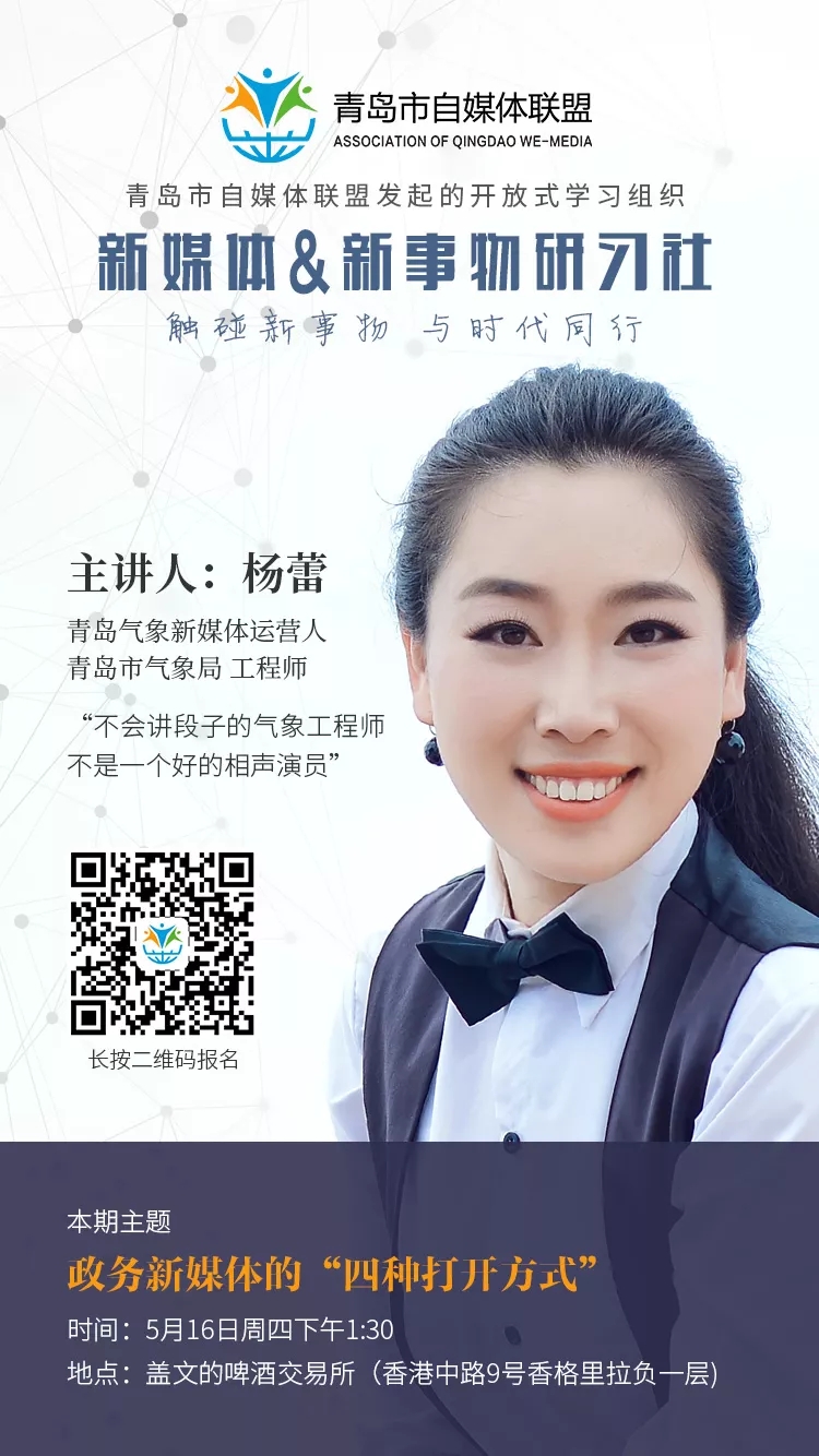 為了幫助政務新媒體更好地運營,5月16日,由青島市自媒體聯盟主辦的新媒體&新事物研習社第十期邀請到了青島氣象新媒體運營人、青島市氣象局工程師楊蕾為大家?guī)怼罢招旅襟w的四種打開方式”主題分享。