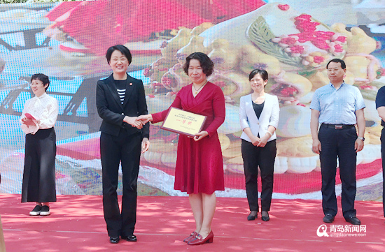 青島市婦聯(lián)主席方妍為一等獎(jiǎng)得主遲金燕頒獎(jiǎng)。