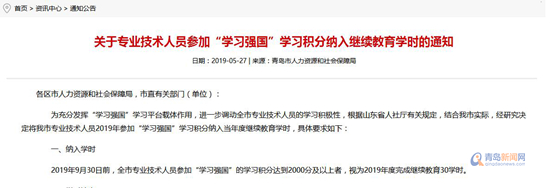 青島新聞網(wǎng)5月28日訊 (記者 張萍)昨日,市人社局下發(fā)通知,根據(jù)山東省人社廳有關(guān)規(guī)定,結(jié)合我市實(shí)際,經(jīng)研究決定將我市專業(yè)技術(shù)人員2019年參加“學(xué)習(xí)強(qiáng)國(guó)”學(xué)習(xí)積分納入當(dāng)年度繼續(xù)教育學(xué)時(shí)。具體政策為:2019年9月30日前,全市專業(yè)技術(shù)人員參加“學(xué)習(xí)強(qiáng)國(guó)”的學(xué)習(xí)積分達(dá)到2000分及以上者,視為2019年度完成繼續(xù)教育30學(xué)時(shí)。
