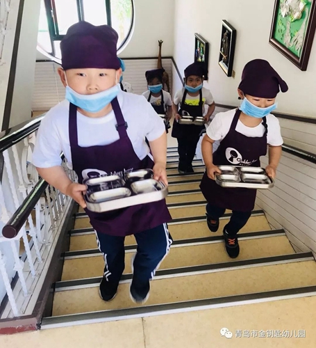 陣容強大的保育阿姨要幫小朋友送餐具啦~原來阿姨每天都要拿這么重的餐具和飯菜呀,真辛苦!
