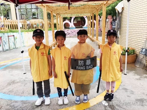 穿上保安叔叔的制服好神氣呀!來離園時間,讓我們和保安叔叔、門衛(wèi)爺爺一起來守護安全吧!