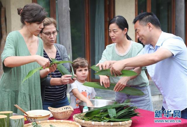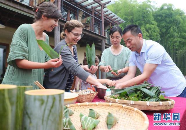 6月2日,在浙江省湖州市德清縣莫干山鎮(zhèn)仙潭村一家民宿內(nèi),來自西班牙的游客在體驗(yàn)包粽子。新華社發(fā)(王正攝)