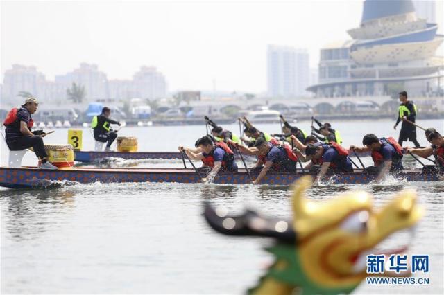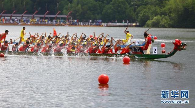 6月2日,人們?cè)诤D鲜∪齺喪腥齺喓由线M(jìn)行賽龍舟。新華社發(fā)(陳文武攝)