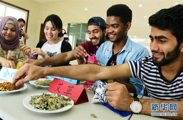 6月2日,在江蘇省鎮(zhèn)江市金江社區(qū),來自江蘇大學(xué)的留學(xué)生在體驗(yàn)制作香囊。新華社發(fā)(石玉成攝)