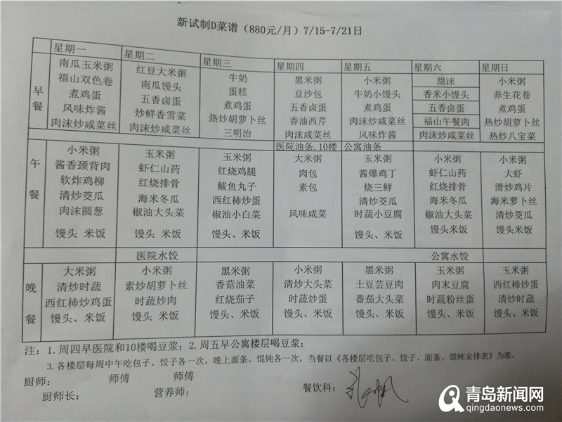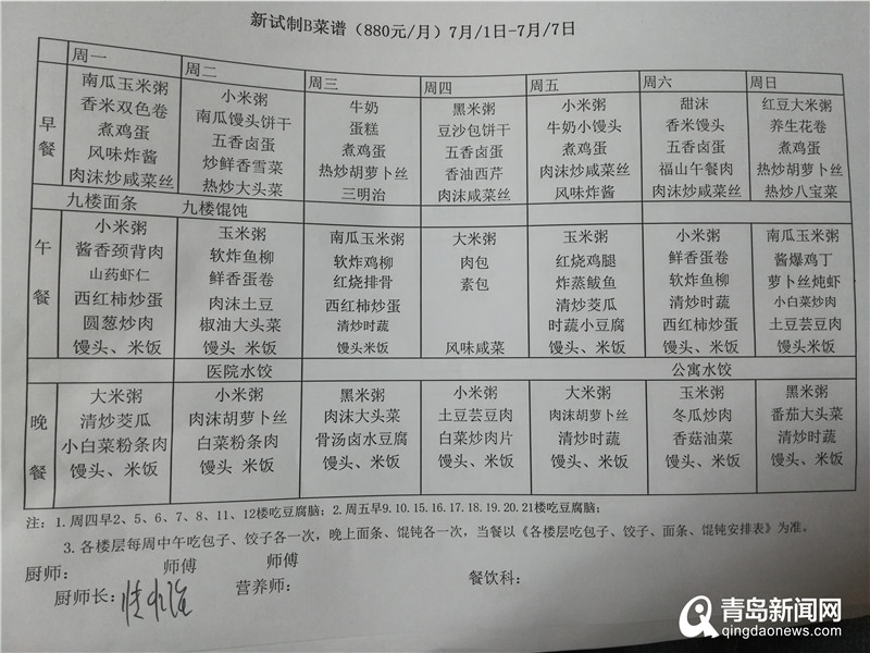 福山老年公寓王院長告訴記者,收到這一信息后公寓內(nèi)部十分重視,對帖子中提到的問題進行核查。首先是飲食質(zhì)量問題,帖子中提到的“餃子里有骨頭渣”、“燉肉變質(zhì)有異味”、“玉米碴子飯、麥粒飯”的情況不存在。關(guān)于每天食譜的制定,王院長表示,養(yǎng)老院與中食安心食品管理有限公司合作,根據(jù)老年人所需營養(yǎng)配比和時令蔬菜制定,做到蛋白質(zhì)、脂肪、碳水化合物配比合理。