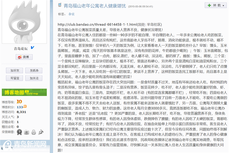 記者聯(lián)系了發(fā)帖人,他表示并不是自家老人在福山養(yǎng)老院,帖子是從微博轉(zhuǎn)載的。記者到網(wǎng)上搜索發(fā)現(xiàn),2015年5月6日,ID為【青島論壇】的用戶發(fā)表過一篇內(nèi)容大體一致的博文。