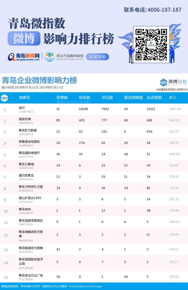青島新聞網(wǎng)7月29日訊(記者 邢書玲)由青島新聞網(wǎng)、清博指數(shù)平臺聯(lián)手打造的“青島微指數(shù)微博影響力排行榜”今日發(fā)布一周(7月21日-7月27日)榜單。