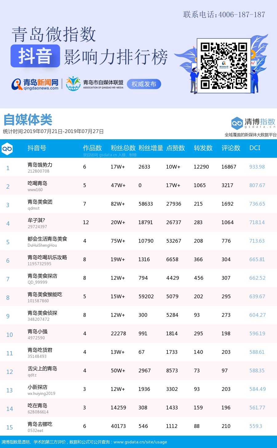 青島新聞網(wǎng)7月29日訊(記者 邢書玲)由青島新聞網(wǎng)、清博指數(shù)平臺(tái)聯(lián)手打造的“青島微指數(shù)抖音影響力排行榜”今日發(fā)布一周(7月21日-7月27日)榜單。