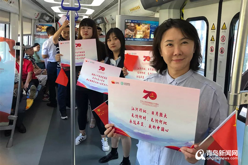 當天,在開行的“國慶號”上,青島地鐵文化傳媒公司的員工們開展了“獻給祖國的三行情詩”現場展示活動,在車廂內營造了濃濃的愛國氛圍。員工們通過短短的三行詩句,表達對祖國母親深深的祝福。