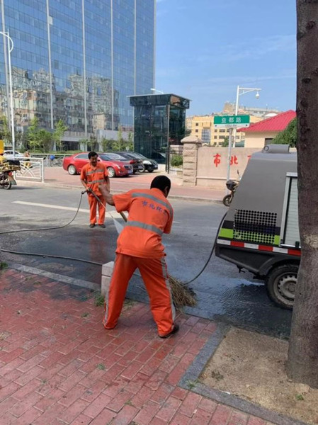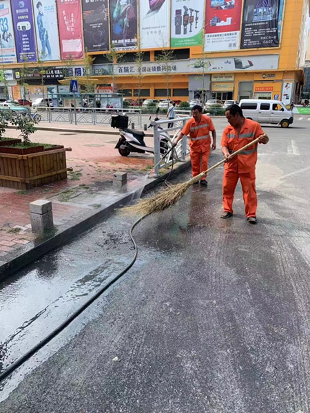 工人們頂著烈日和刺鼻的異味,使用灑水車邊灑水邊用掃帚一點一點的將厚達2厘米的污水淤泥清理干凈。之后再多次反復沖洗路面,經(jīng)過工人們40多分鐘的集中清理,最終使現(xiàn)場道路恢復原貌。