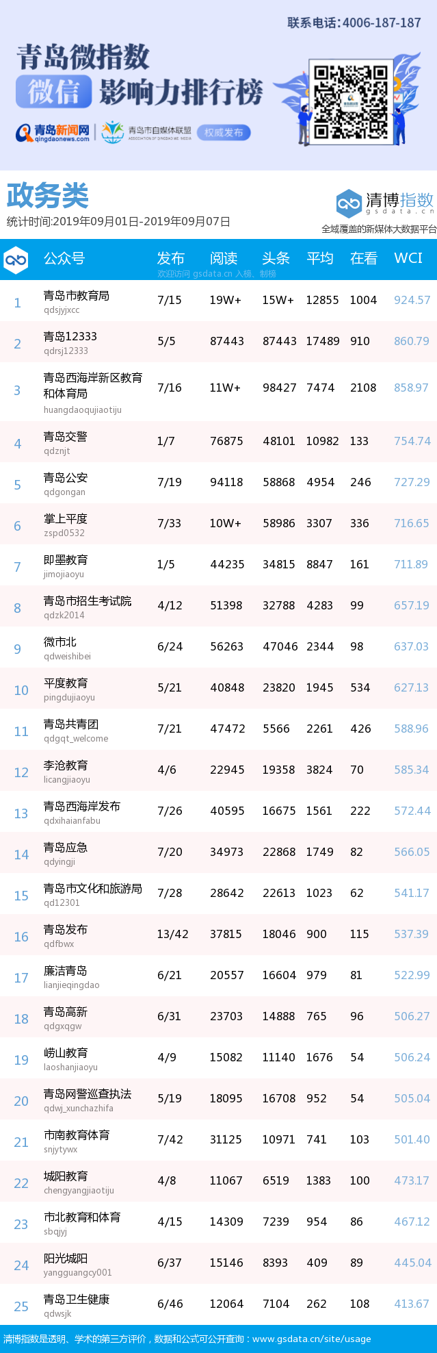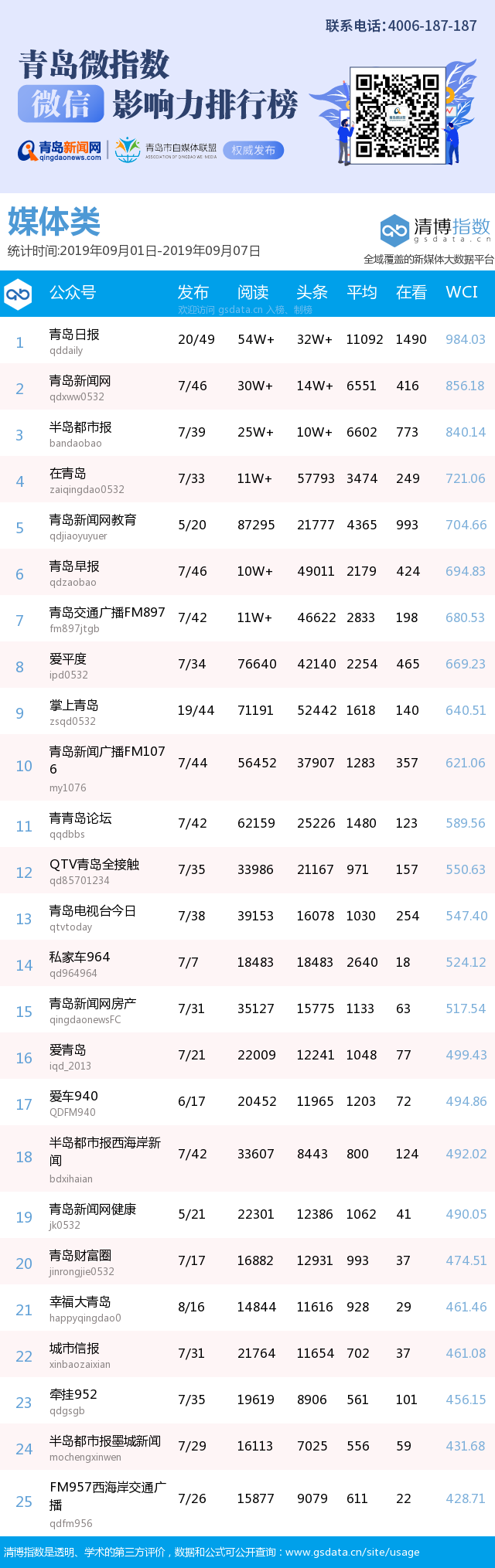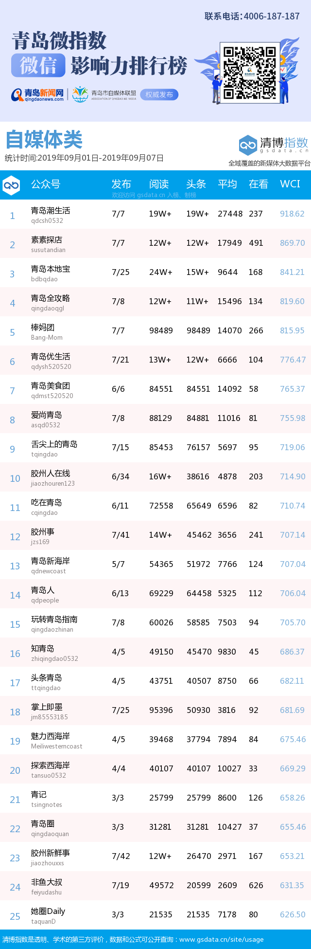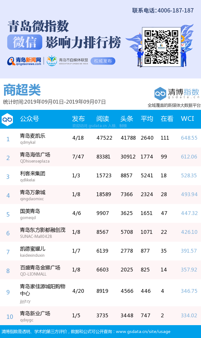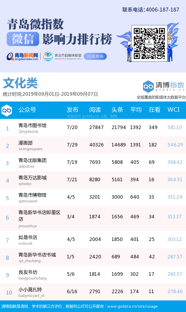 青島新聞網(wǎng)9月10日訊(記者 邢書玲)由青島新聞網(wǎng)、清博指數(shù)平臺(tái)聯(lián)手打造的“青島微指數(shù)微信影響力排行榜”今日發(fā)布一周(9月1日-9月7日)榜單。