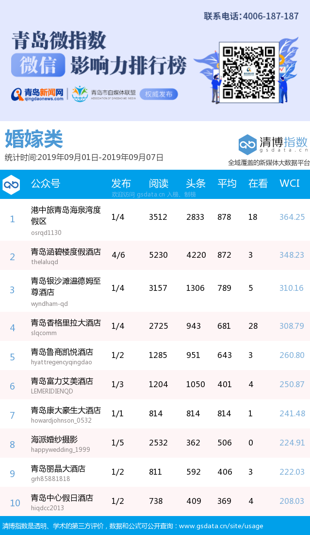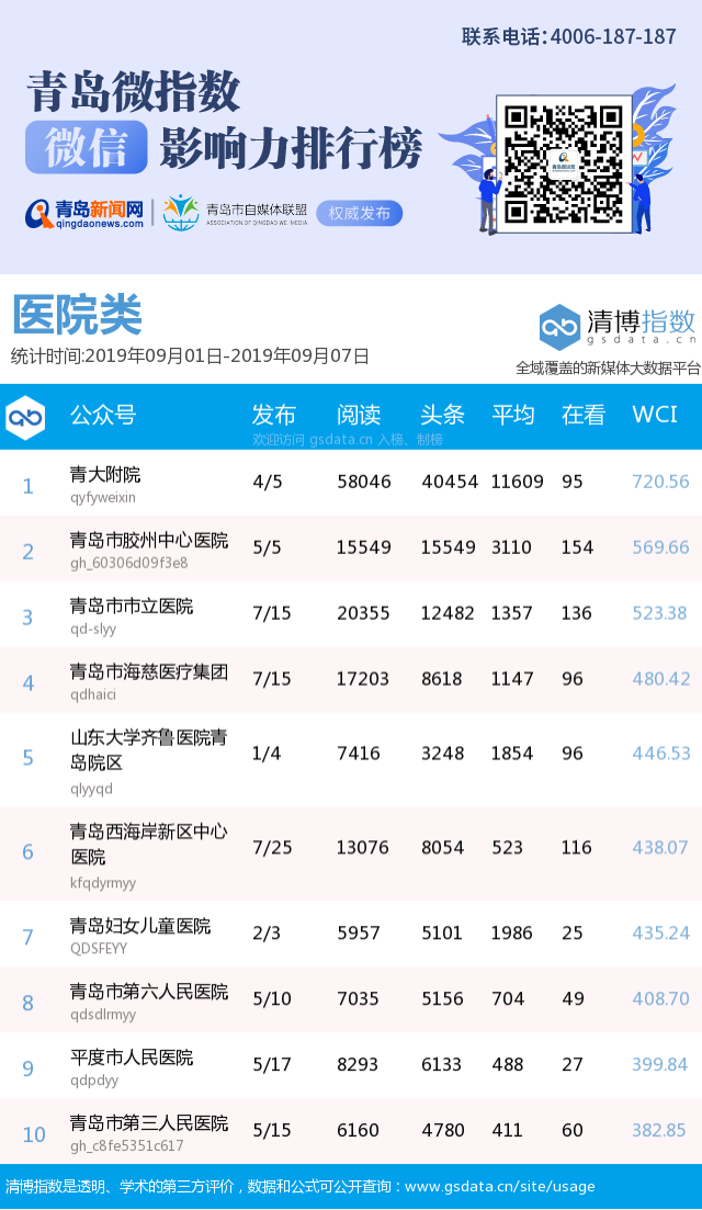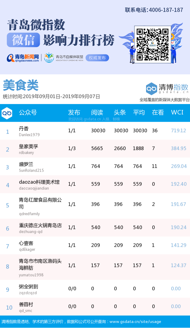 3、本次榜單收錄了青島14個(gè)行業(yè)微信公眾號(hào),如您的賬號(hào)暫未收錄,可聯(lián)系4006-187-187。