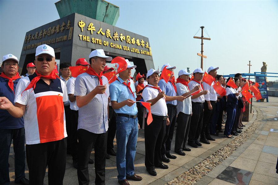 全體人員面向國旗列隊站立,活動在升國旗、齊唱國歌聲中開始。中國海洋學會海洋旅游分會理事長、青島市旅游協(xié)會會長、銀海集團董事長辛華龍帶領大家回顧新中國成立70年走過的艱辛歷程和取得的輝煌成就。他倡議:中華人民共和國水準零點是測量世界最高峰珠穆朗瑪峰的起點,如同中華民族從無到有,從站起來,富起來到強起來實現(xiàn)飛越,堅實地走向世界最高峰。邁進新時代的今天,我們作為新時代的企業(yè)家們依然奮斗著、努力著,迎著改革開放40周年的大潮激流勇進,不忘初心,牢記使命,砥礪前行。