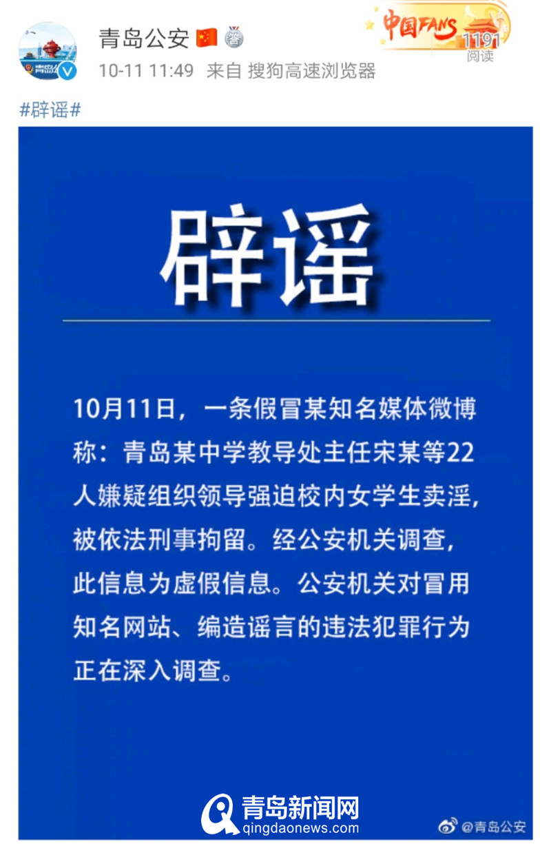 青島新聞網(wǎng)10月11日訊(記者 丁淑華)10月11日,網(wǎng)傳某知名媒體微博截圖稱“青島某中學(xué)教導(dǎo)處主任宋某等22人嫌疑組織領(lǐng)導(dǎo)強迫校內(nèi)女學(xué)生賣淫,被依法拘留。”經(jīng)公安機關(guān)調(diào)查,此信息為虛假信息。