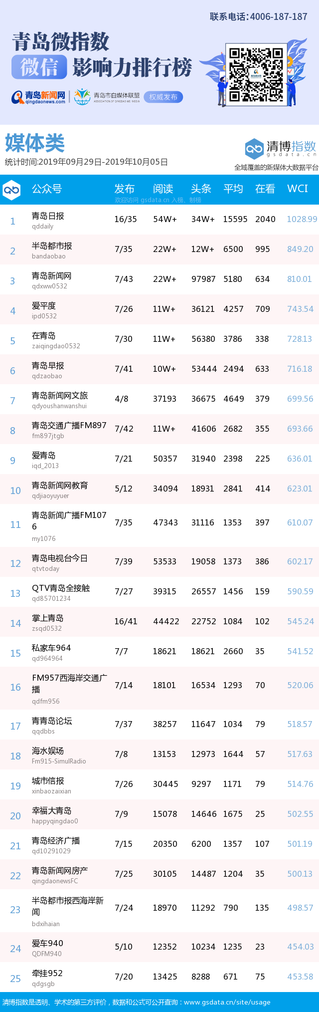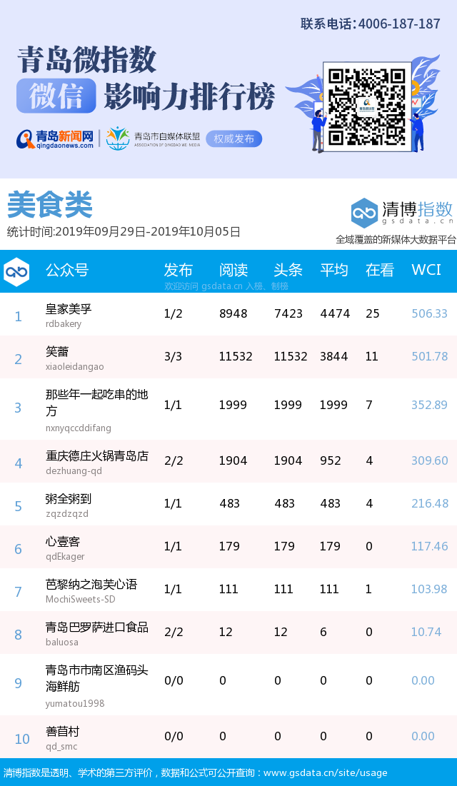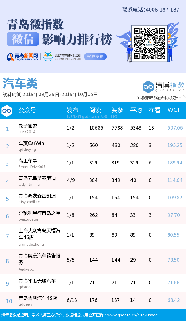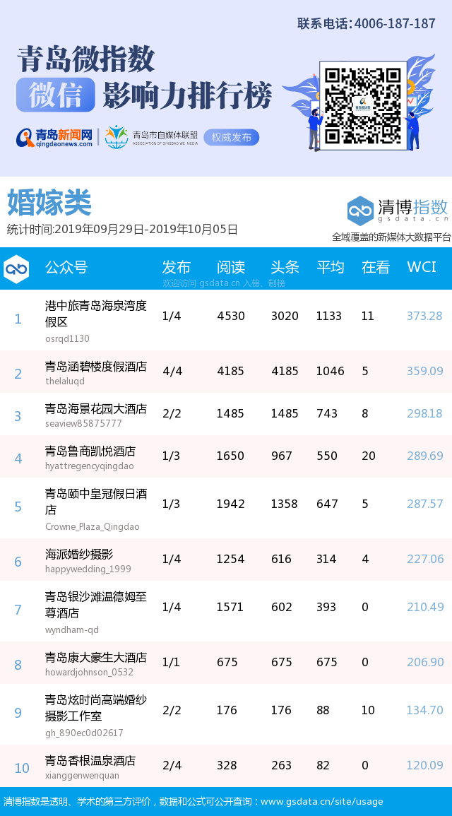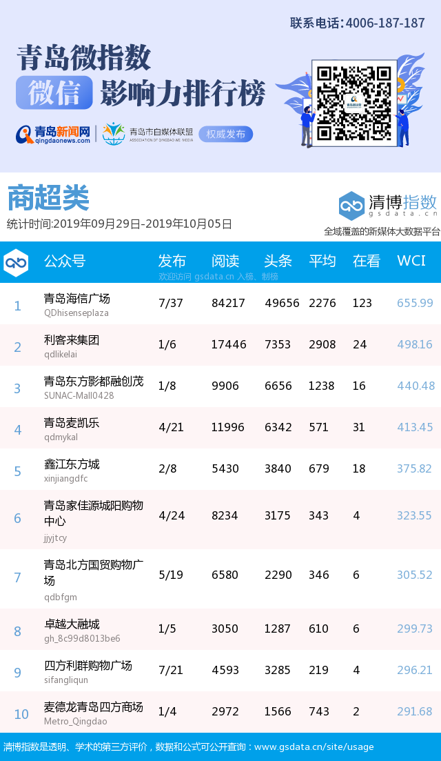 3、本次榜單收錄了青島14個(gè)行業(yè)微信公眾號(hào),如您的賬號(hào)暫未收錄,可聯(lián)系4006-187-187。