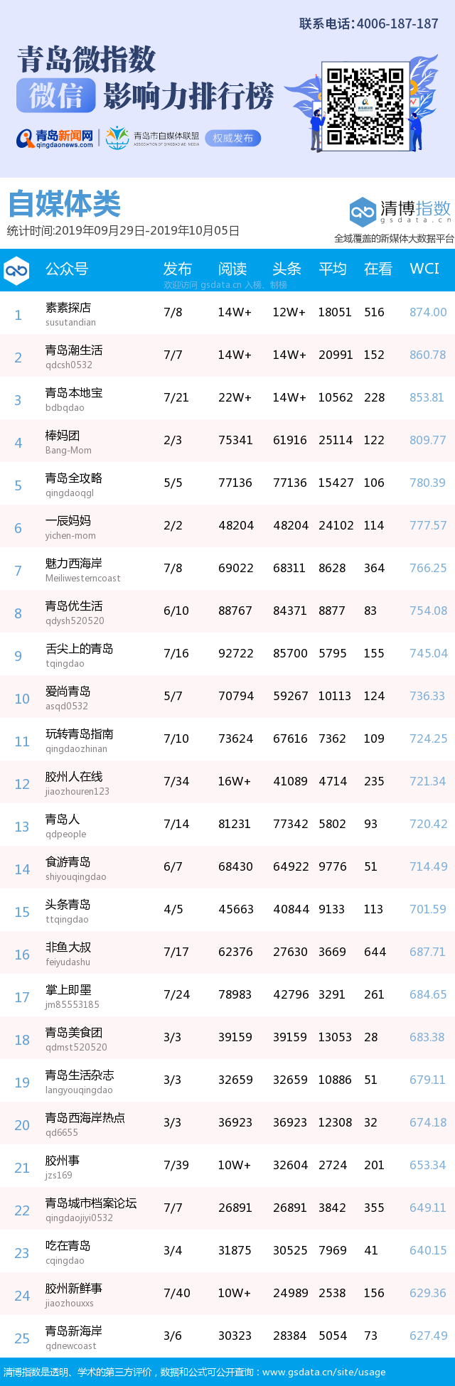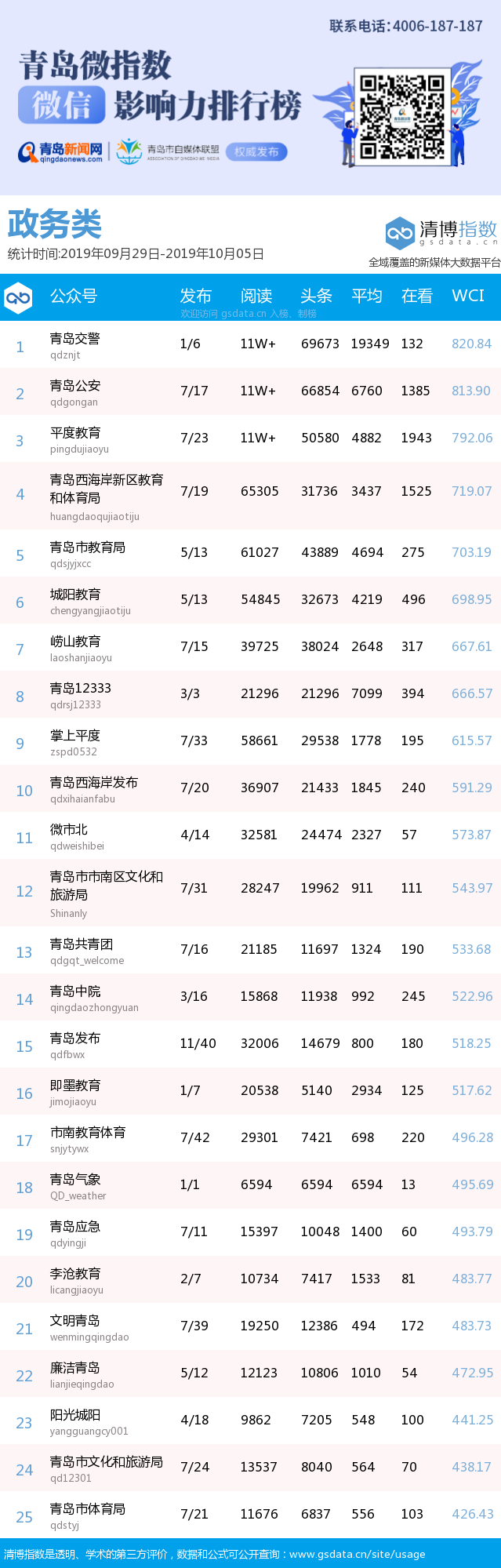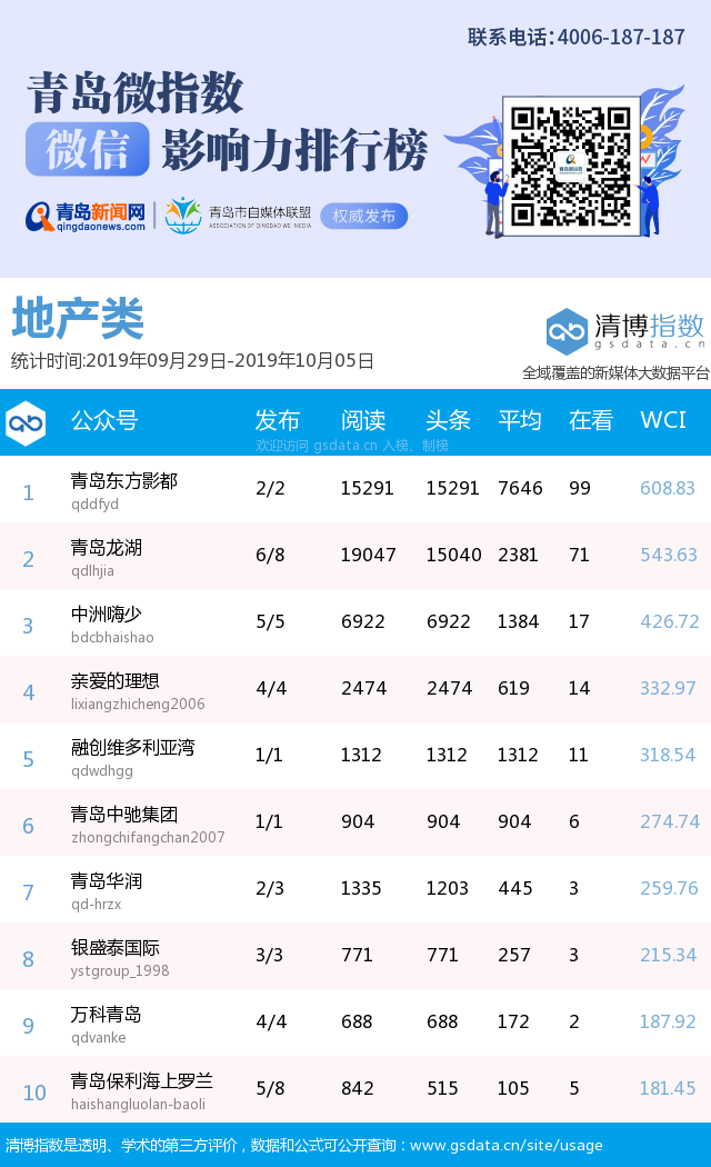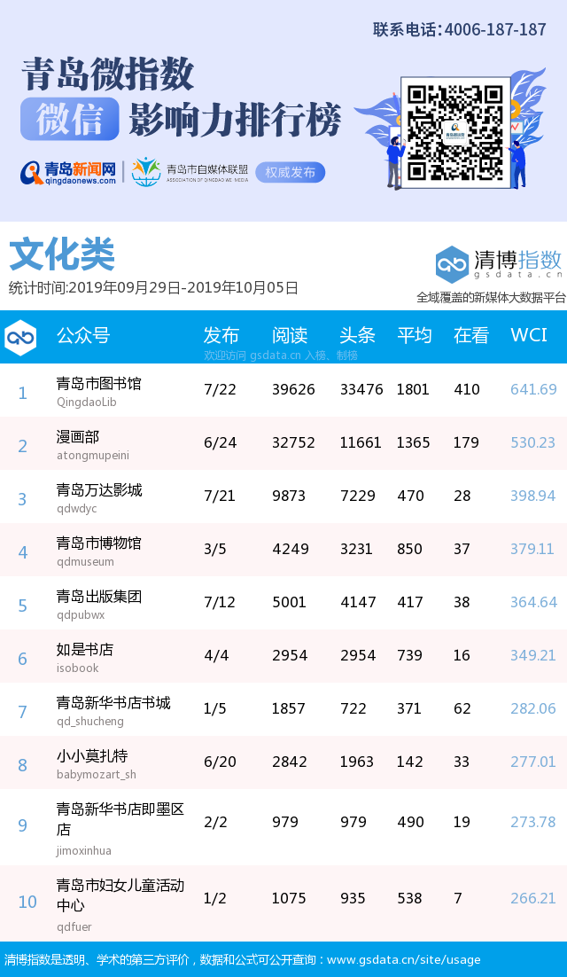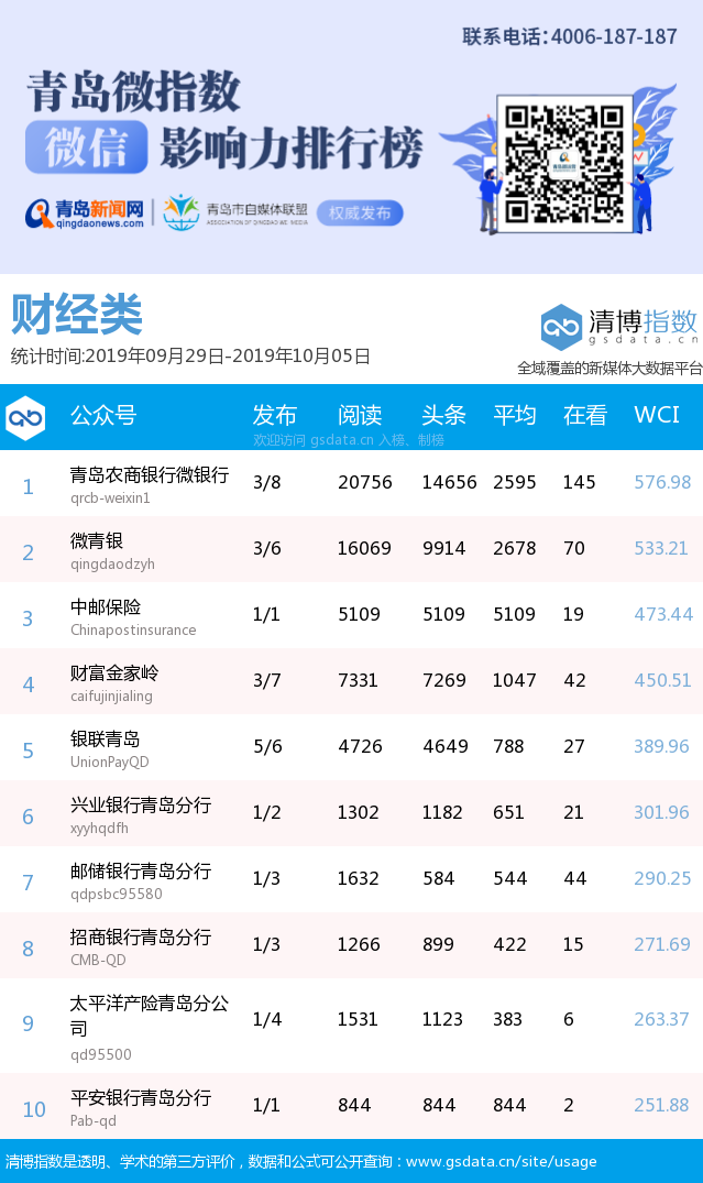 青島新聞網(wǎng)10月15日訊(記者 邢書玲)由青島新聞網(wǎng)、清博指數(shù)平臺(tái)聯(lián)手打造的“青島微指數(shù)微信影響力排行榜”今日發(fā)布一周(9月29日-10月5日)榜單。