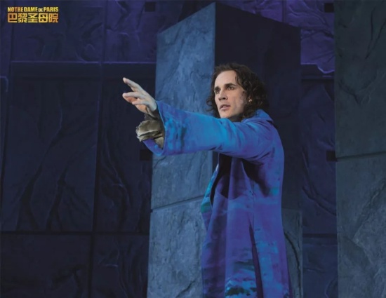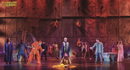 但仔細觀察即可發(fā)現(xiàn),法語音樂劇中將歌舞分離的處理十分明顯:唱歌的演員不參與舞蹈表演。服裝、化妝、舞臺背景設計都走現(xiàn)代化的路線,抽象簡約但又展現(xiàn)了圣母院的滄桑,角色的性格。在舞臺上大量使用光影特效與威亞特技,增強了關鍵劇情的張力。