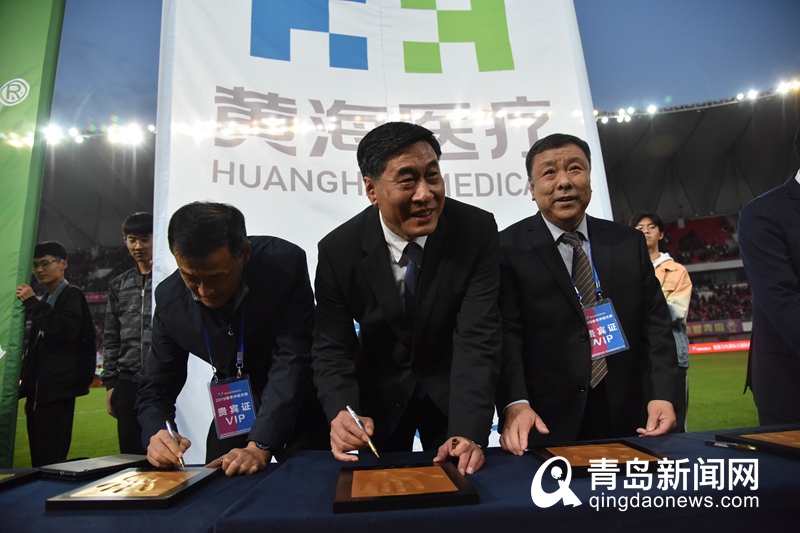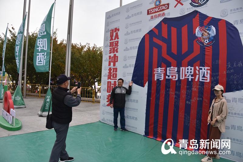 “青島啤酒”球衣前,不少球迷留下簽名,同時合影留念,記錄“沖超時刻”。