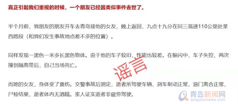 經(jīng)“山東高速交警”核實(shí),青島、煙臺(tái)高速交警近年來(lái)均未接到過有關(guān)投擲障礙物從而引發(fā)交通事故進(jìn)行搶劫類的警情,文中所提到的同三高速已于2007年改名為沈海高速,威烏高速也已于2007年改名為榮烏高速。2009年以來(lái)該虛假信息在互聯(lián)網(wǎng)多次傳播,為此“青島公安”在2012年10月2日,通過微博專門發(fā)布過辟謠信息。