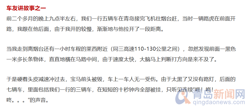 文中寫到,青島到煙臺(tái)路段出現(xiàn)高速公路搶劫事件,其搶劫方式以汽車保險(xiǎn)杠為路障,致使行駛車輛發(fā)生車禍,并趁車主急需救援時(shí)上車搶劫。該文因描述事件駭人聽聞且切實(shí)關(guān)系到萊西路段高速行車安全,而引起人們的恐慌。