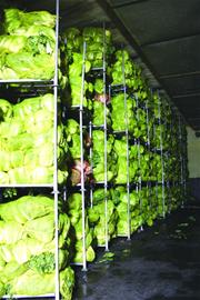 記者隨工作人員進(jìn)入冷庫發(fā)現(xiàn),高達(dá)十余米的貨架上全部都擺放著綠幫兒黃心兒的大白菜。冷庫技術(shù)員介紹說,儲藏大白菜的溫度在0℃度左右最好,正負(fù)之間不能超過1℃。冷庫溫度一旦有變化,冷氣機(jī)會自動開始制冷。