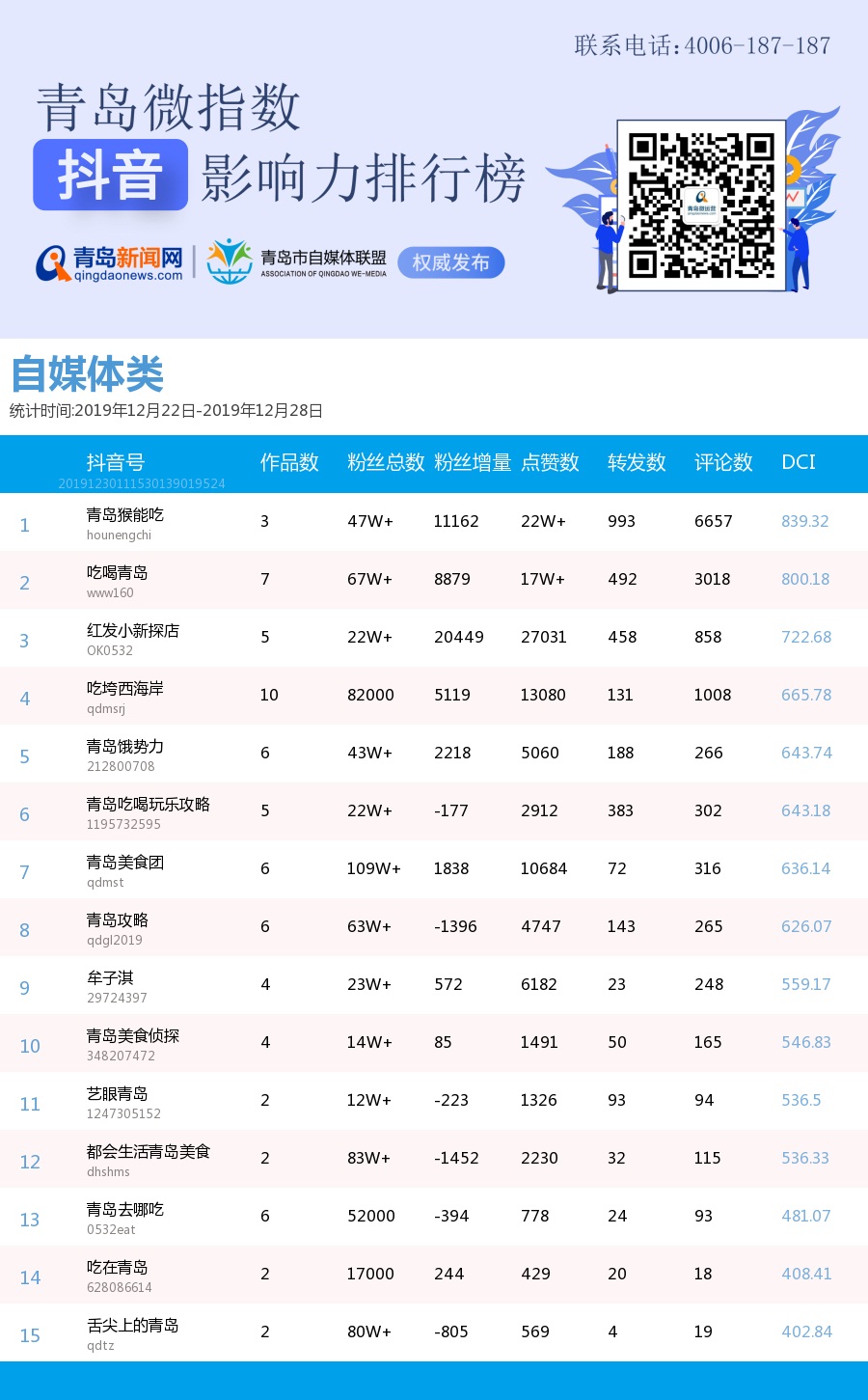 青島新聞網(wǎng)12月30日訊(記者 邢書玲)由青島新聞網(wǎng)、清博指數(shù)平臺聯(lián)手打造的“青島微指數(shù)微博影響力排行榜”今日發(fā)布一周(12月22日-12月28日)榜單。