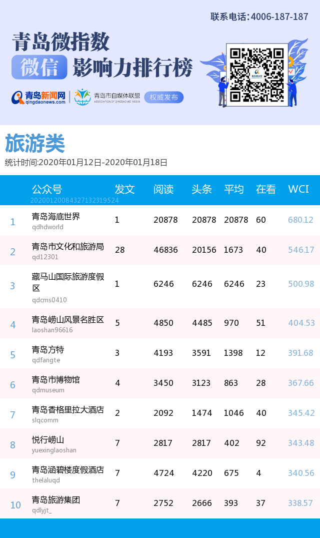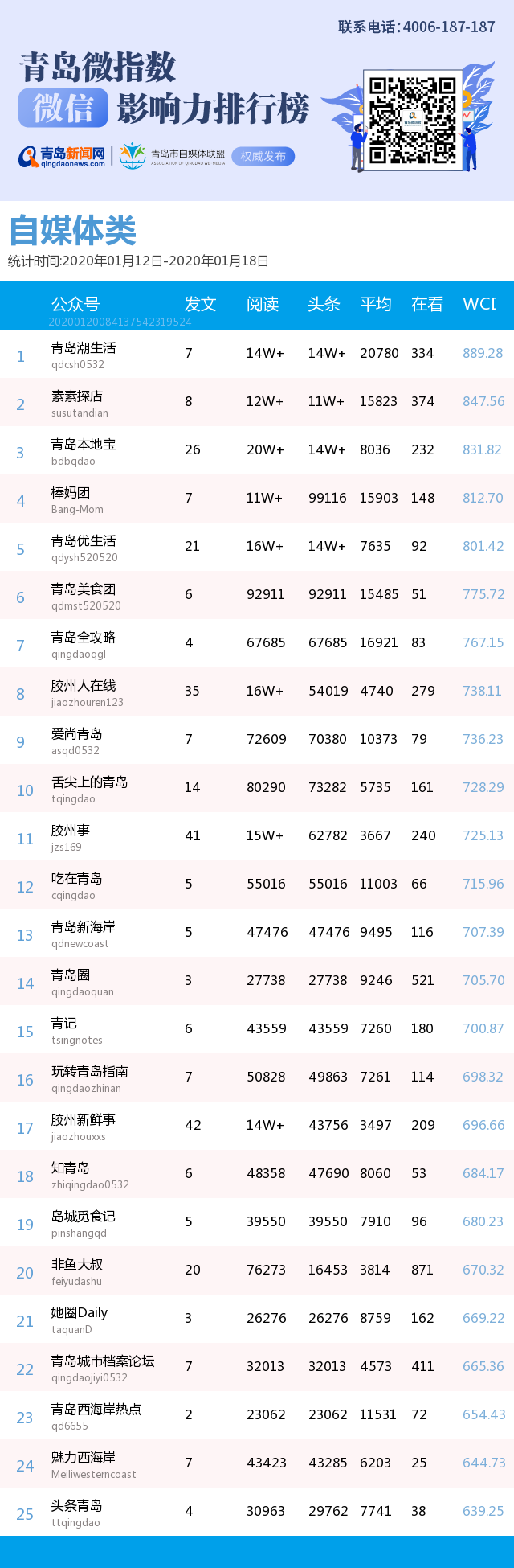 青島新聞網(wǎng)1月20日訊(記者 邢書玲)由青島新聞網(wǎng)打造的“青島微指數(shù)微信影響力排行榜”今日發(fā)布一周(2020年1月12日-2020年1月18日)榜單。