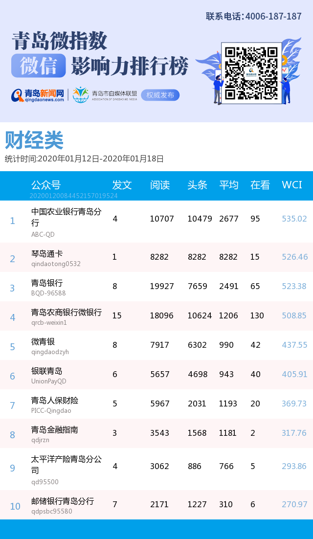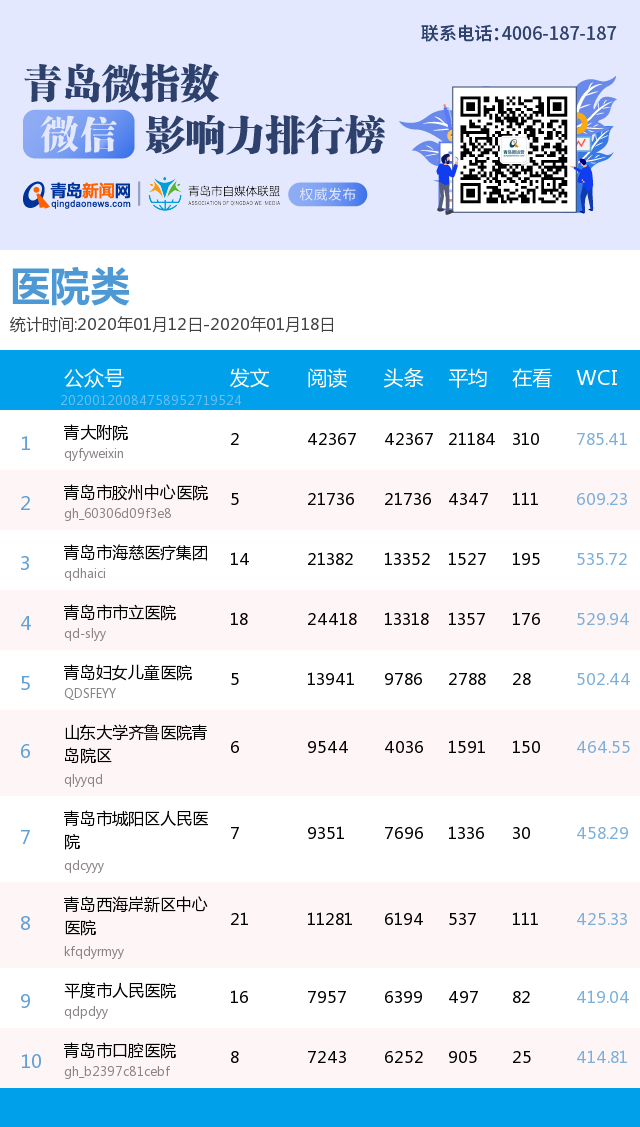 3、本次榜單收錄了青島14個(gè)行業(yè)微信公眾號(hào),如您的賬號(hào)暫未收錄,可聯(lián)系4006-187-187。