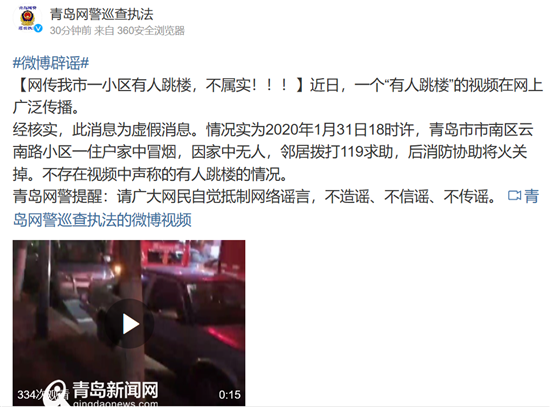 青島新聞網(wǎng)2月3日訊(記者丁淑華)近日,“青島某小區(qū)有人跳樓”的視頻在網(wǎng)上廣泛傳播。經(jīng)核實(shí),此消息為虛假消息。情況實(shí)為2020年1月31日18時(shí)許,青島市市南區(qū)云南路小區(qū)一住戶家中冒煙,因家中無人,鄰居撥打119求助,后消防協(xié)助將火關(guān)掉。不存在視頻中聲稱的有人跳樓的情況。