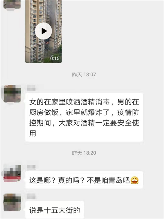 記者經(jīng)過核實發(fā)現(xiàn),在上海、武漢均發(fā)現(xiàn)了類似的傳言,而且傳言中的視頻,和青島的這段視頻一模一樣。這些傳言稱,是居民在家噴灑酒精消毒,遇到做飯的明火將房屋引燃。但是,上海、武漢等地消防部門均已第一時間辟謠。2月5日上午,記者聯(lián)系了青島市消防救援支隊后獲悉,青島市消防救援支隊近期并沒有到十五大街出過警,這一消息并不屬實。