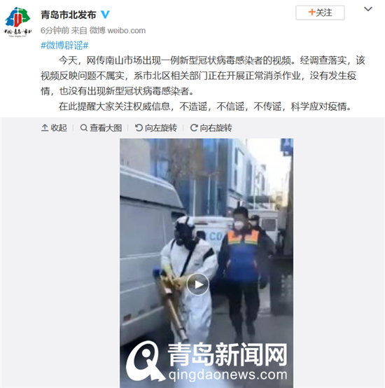 青島新聞網(wǎng)1月30日訊(記者 丁淑華)今天,網(wǎng)傳南山市場出現(xiàn)一例新型冠狀病毒感染者的視頻。經(jīng)調查落實,該視頻反映問題不屬實,系市北區(qū)相關部門正在開展正常消殺作業(yè),沒有發(fā)生疫情,也沒有出現(xiàn)新型冠狀病毒感染者。