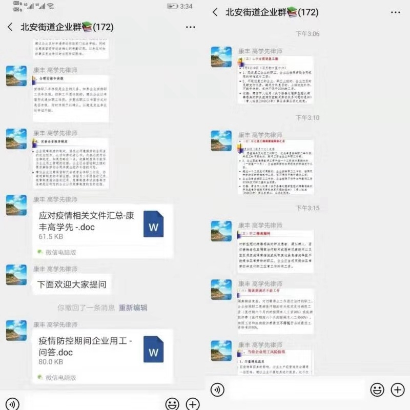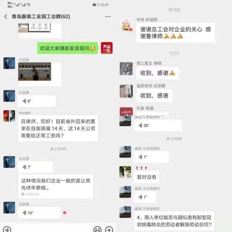 2月6日以來,即墨區(qū)各鎮(zhèn)街、工業(yè)園區(qū)的企業(yè)工會(huì)微信群里都熱鬧了起來,即墨工會(huì)法律顧問團(tuán)的律師被邀請(qǐng)到各企業(yè)群內(nèi)開展“線上普法大講堂”,“課堂”之上,律師們針對(duì)受疫情影響延長假期、延期復(fù)工的企業(yè)通過圖片、文字及語音等多種形式做了詳細(xì)全面的法律指導(dǎo),贏得了廣大企業(yè)的好評(píng)和感謝,大多原計(jì)劃40分鐘的講座,被熱情的提問拖成了一個(gè)多小時(shí)。