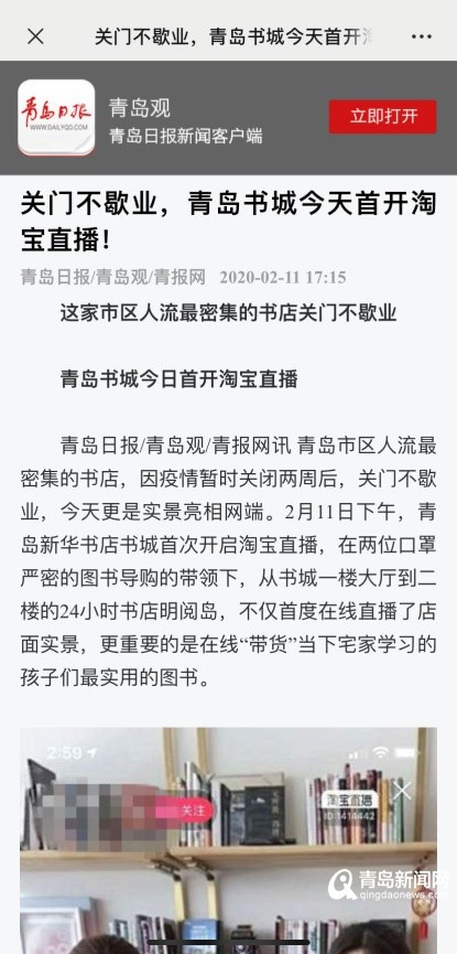 書城暫停營業(yè)期間,廣泛宣傳線上服務方式。一是發(fā)動職工,在朋友圈、微信群、家長群等發(fā)布書城線上店鋪的營業(yè)消息。二是積極與市南文旅局、珠海路街道辦事處、愛青島客戶端等平臺對接,宣傳書城線上服務方式,讓更多人了解書城官方店鋪。2020年2月5日,與市南文旅局、愛情島聯(lián)合推出“相信閱讀的力量”書單,進一步擴大覆蓋面。2020年2月11日,青島書城進行首次淘寶直播帶貨,青島日報對此次直播進行報道,向市民宣傳暫停營業(yè)期間可以選擇到書城線上選書。