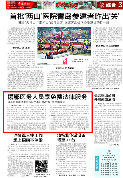 1月24日,隨山東省支援湖北醫(yī)療隊(duì)集結(jié),青島派出了第一批援鄂醫(yī)療隊(duì)。2月8日,青島市再次組建2支援鄂醫(yī)療隊(duì)。目前,全市已有304名醫(yī)務(wù)人員在湖北抗疫一線,他們以實(shí)際行動(dòng)弘揚(yáng)了“敬佑生命、救死扶傷、甘于奉獻(xiàn)、大愛(ài)無(wú)疆”的職業(yè)精神,是青島人民的勇士。為表達(dá)出對(duì)奮戰(zhàn)在抗“疫”一線勇士的敬意與關(guān)愛(ài),山東德衡律師事務(wù)所(以下簡(jiǎn)稱(chēng)“德衡所”)聯(lián)手青島晚報(bào)掌控全媒體,共同為全體青島援鄂醫(yī)務(wù)人員及其直系親屬提供免費(fèi)法律咨詢(xún)服務(wù)。