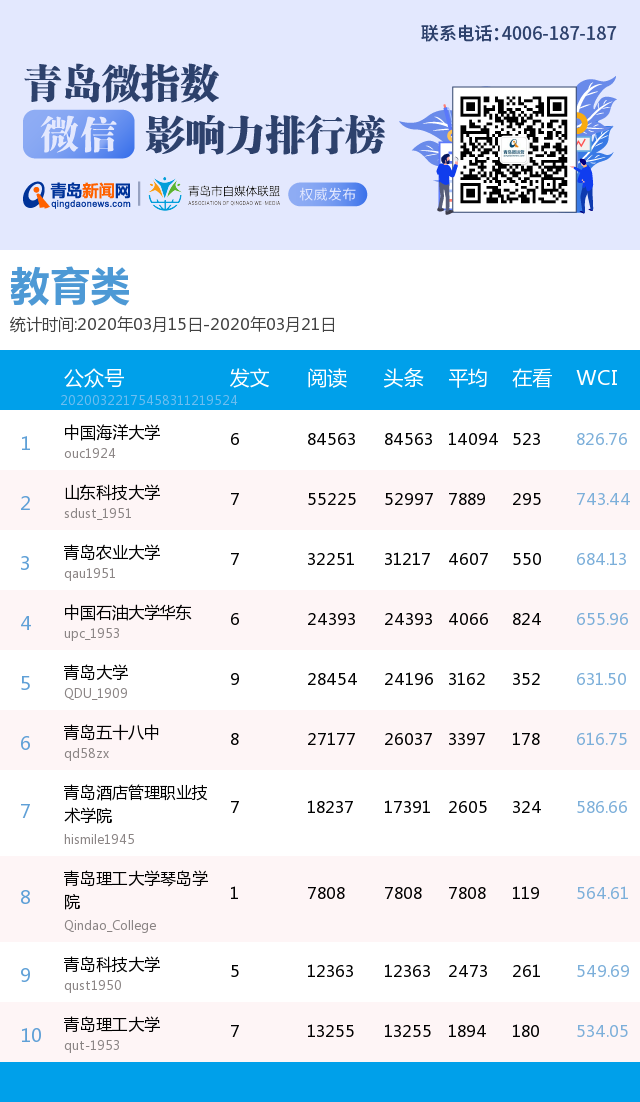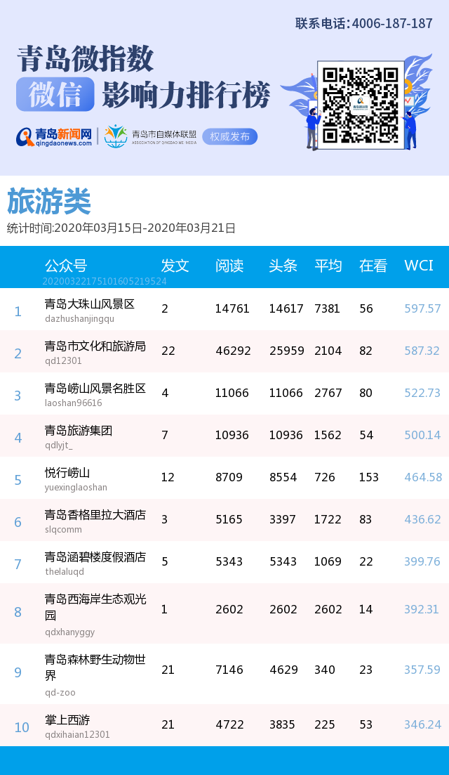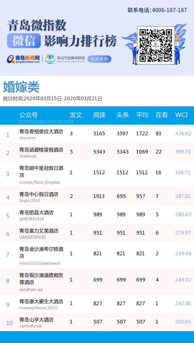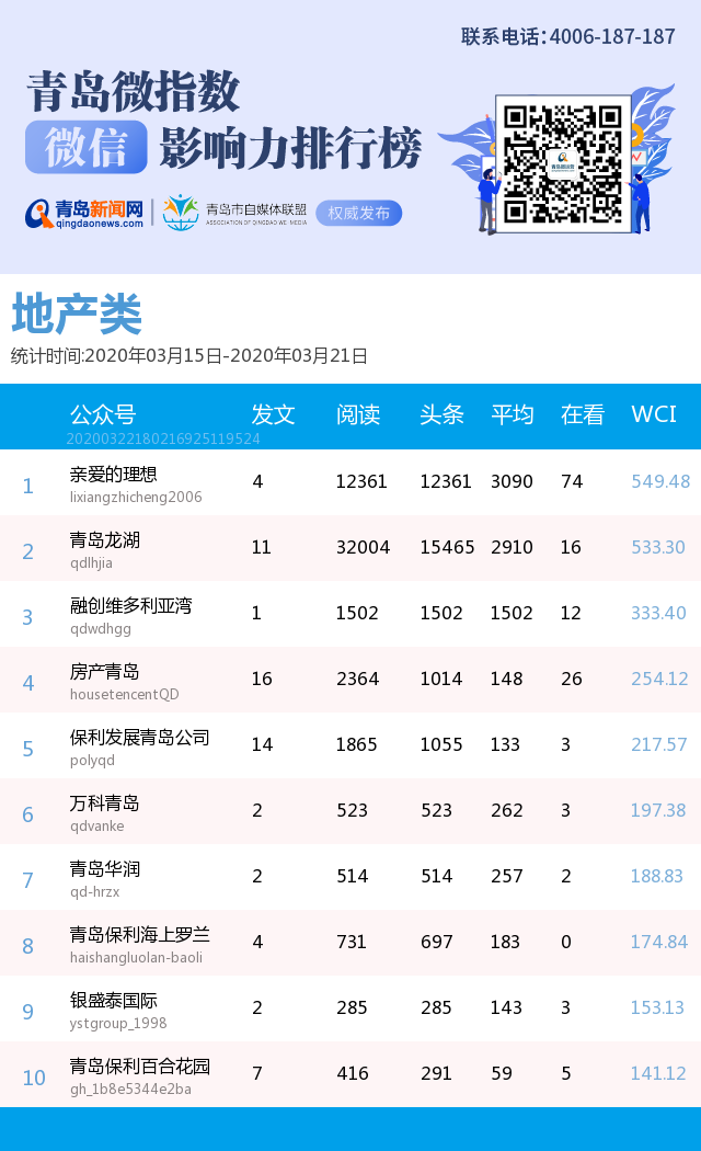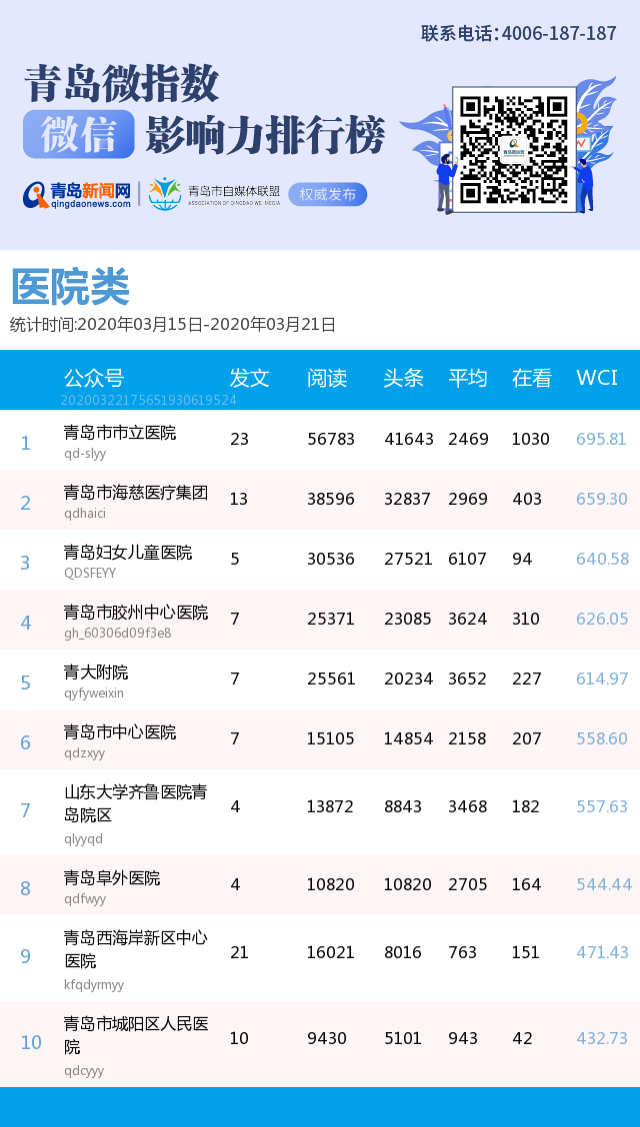 3、本次榜單收錄了青島14個行業(yè)微信公眾號,如您的賬號暫未收錄,可聯(lián)系4006-187-187。