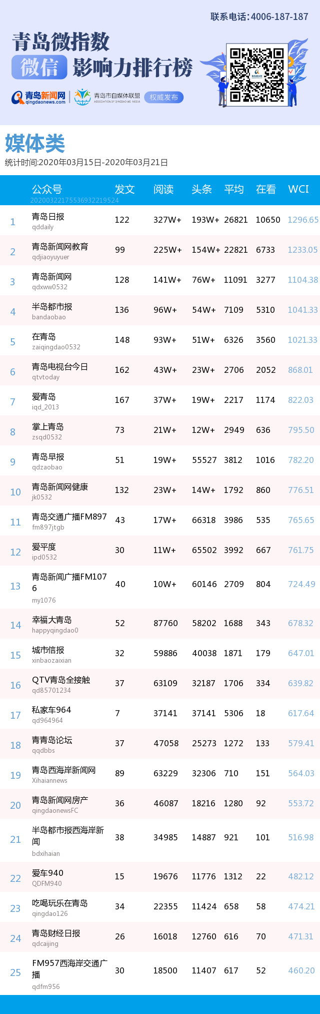 青島新聞網(wǎng)3月23日訊(記者 邢書玲)由青島新聞網(wǎng)打造的“青島微指數(shù)微信影響力排行榜”今日發(fā)布一周(2020年3月15日-2020年3月21日)榜單。