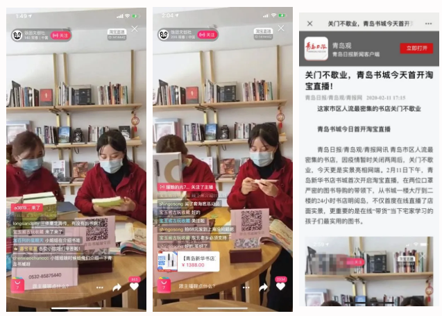除去值班人員需要嚴格的消毒與體溫管理外,青島書城下屬4家線上店鋪,分別在天貓(2家)、淘寶和京東?,F(xiàn)階段為滿足假期及開學季前讀者的剛需,上架品種以教材教輔、假期推薦閱讀書目為主,少兒讀物、社科文藝為輔。書城暫停營業(yè)期間,廣泛宣傳線上服務方式。2020年2月5日,青島書城與市南文旅局、愛情島聯(lián)合推出“相信閱讀的力量”書單,進一步擴大覆蓋面。2020年2月11日,青島書城進行首次淘寶直播帶貨,青島日報對此次直播進行報道,向市民宣傳暫停營業(yè)期間可以選擇到書城線上選書。