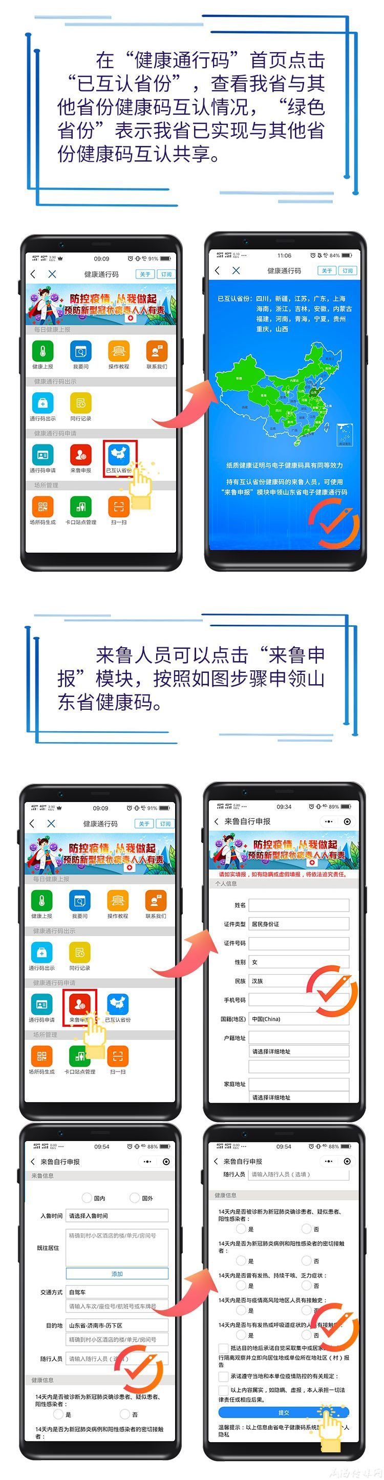 可通過“已互認(rèn)省份”查看山東省與其他省份健康碼互認(rèn)情況。截至目前,已有廣東、上海、浙江等17省市與山東簽訂互認(rèn)協(xié)議。從這些省份來魯(返魯)的人員,到達山東省后憑省外綠碼一律放行,不需隔離。為了更加便于省內(nèi)通行,建議來魯人員下載“愛山東”使用“來魯申報”模塊,申領(lǐng)“健康通行碼”。如下圖: