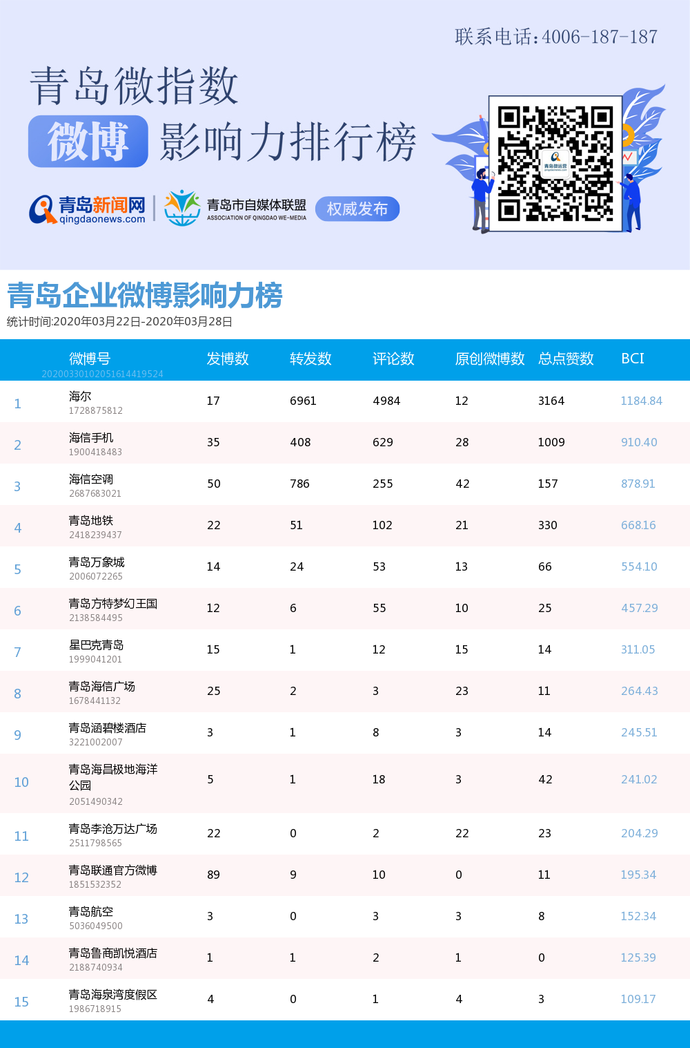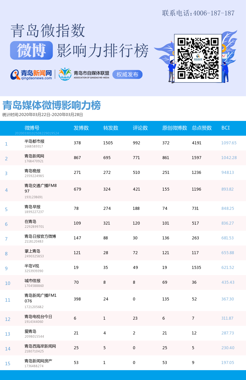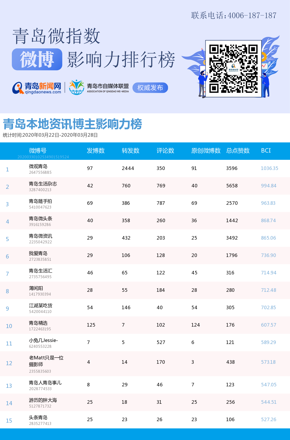 青島新聞網(wǎng)3月30日訊(記者 邢書玲)由青島新聞網(wǎng)、清博指數(shù)平臺(tái)聯(lián)手打造的“青島微指數(shù)微博影響力排行榜”今日發(fā)布一周(3月22日-3月28日)榜單。