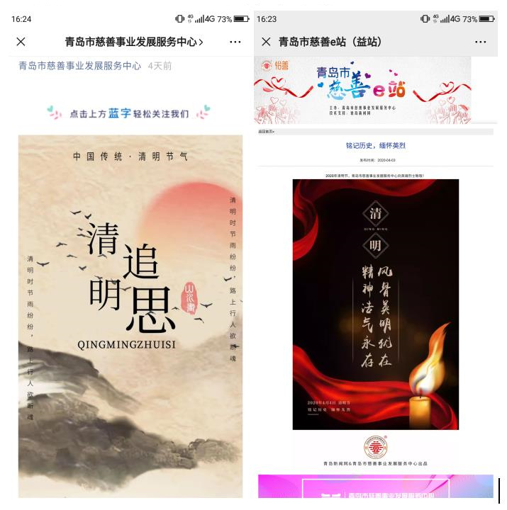 中心通過(guò)“青島市慈善事業(yè)發(fā)展服務(wù)中心”官方微信公眾號(hào)和“青島市慈善e站”發(fā)布了“清明追思”和“銘記歷史,緬懷英烈”主題圖片,組織黨員干部在青島文明網(wǎng)“清明網(wǎng)上祭英烈”“傳承英烈精神、爭(zhēng)做時(shí)代新人”專(zhuān)題頁(yè)面認(rèn)真學(xué)習(xí)郭隆真、解文青、鄧恩銘等革命英烈的崇高事跡,向英烈們獻(xiàn)上鮮花、寄語(yǔ)留言,表達(dá)對(duì)他(她)們的沉痛悼念和崇高敬意,大家深切感受到今天美好生活的來(lái)之不易,進(jìn)一步堅(jiān)定了守好初心擔(dān)使命、立足崗位做慈善的崇高信念。