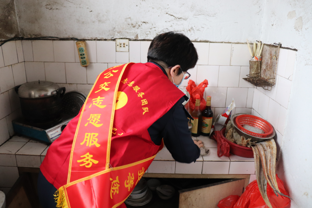 83歲的臧大爺獨(dú)居一人生活,家庭生活十分困難,疫情防控讓臧大爺在家長(zhǎng)時(shí)間沒(méi)有出門,廚房衛(wèi)生較差,房間物品擺放雜亂,志愿者進(jìn)屋挽起袖子就進(jìn)行打掃。志愿者王群在廚房擦洗鍋臺(tái)油跡,洗刷鍋碗瓢盆,將醬料瓶擺放整齊,洗手盆也擦拭一新。