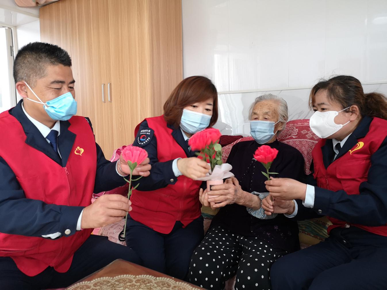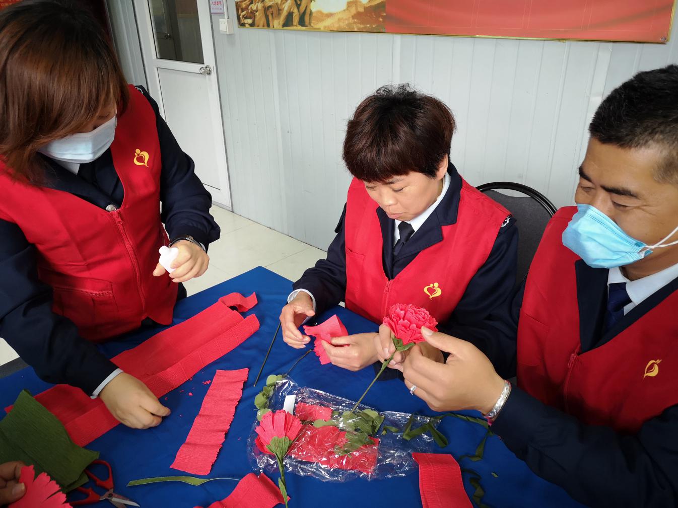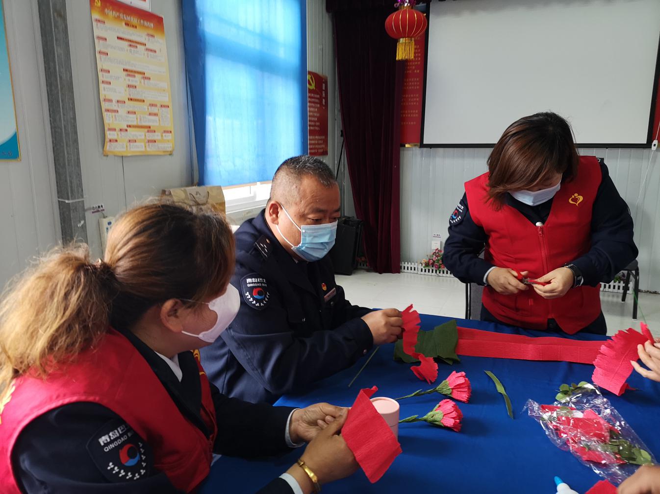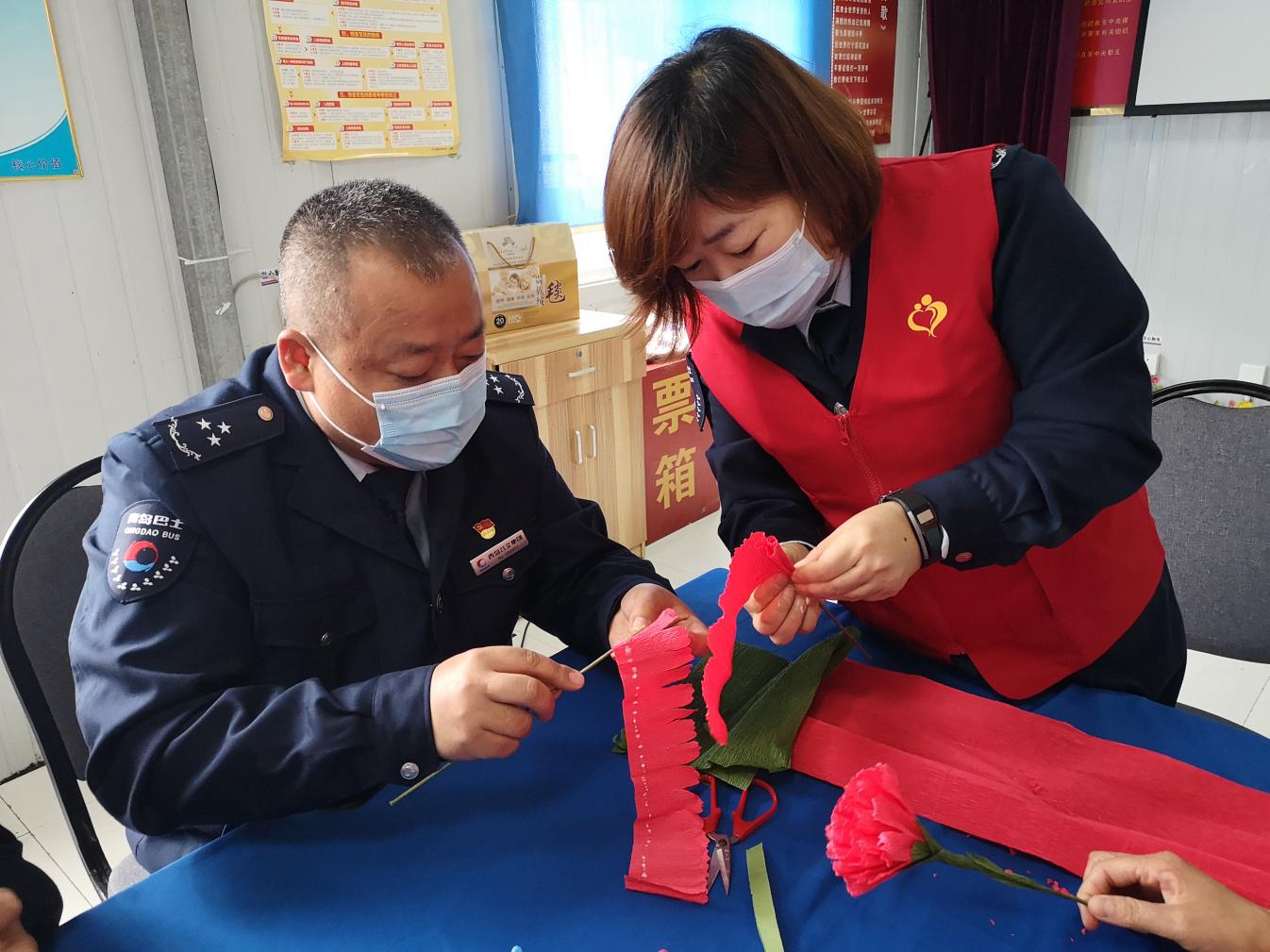 母親節(jié)來到,青島市慈善益站“怡善巴士”青島公交嶗山巴士第六分公司會議室里格外熱鬧,幾位穿著紅馬甲的愛心志愿者正在忙碌著什么,近瞧看來,是六分黨支部書記董善杰在和志愿者孟珂、丁健、熊巖、丁曉、辛偉麗等正在一起精心制作手工花束,大家你一言我一語,裁剪制作的過程讓志愿者們忙的不亦樂乎,生怕哪個細節(jié)出現(xiàn)差錯。兩個小時過去,一朵朵散發(fā)著生機的康乃馨展現(xiàn)在大家面前。志愿者們親手制作的康乃馨花束只為送給嶗山區(qū)金家?guī)X街道王家村社區(qū)85歲高齡的王淑蘭阿姨。因疫情關(guān)系,志愿者們不能全部去探望老人,大家在會議室拍攝了祝福小視頻讓探望王阿姨的志愿者們將祝福送到。