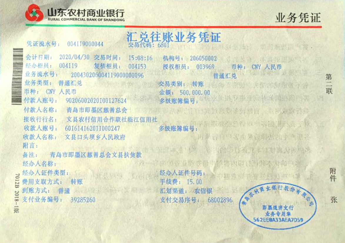 2020年4月30日,青島市即墨區(qū)慈善總會與甘肅文縣口頭壩鄉(xiāng)成家山村簽訂對口幫扶協(xié)議,捐贈幫扶資金50萬元助力村莊脫貧。