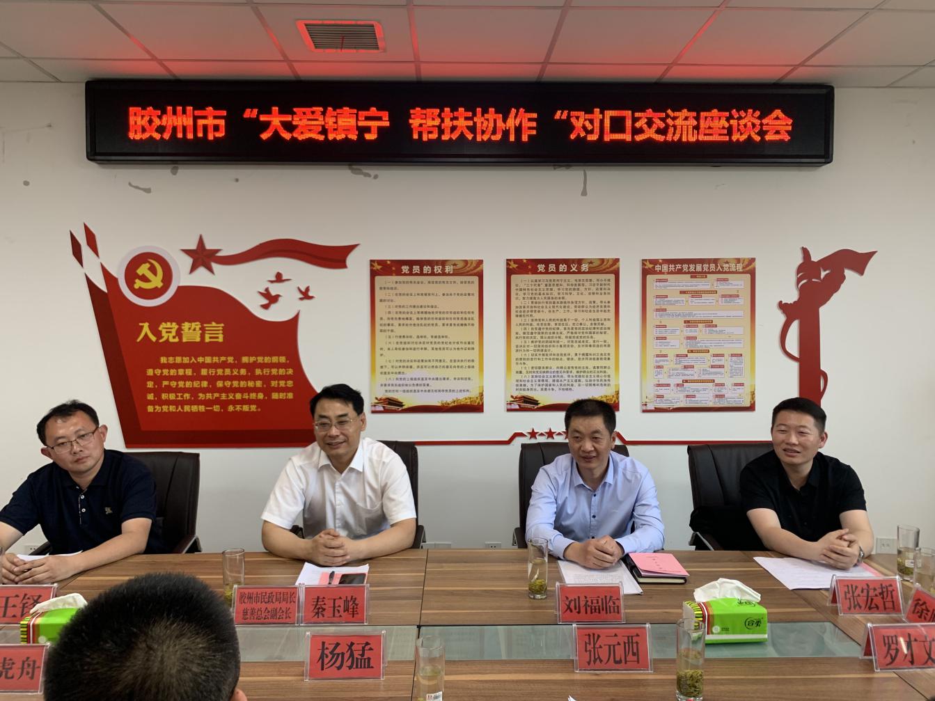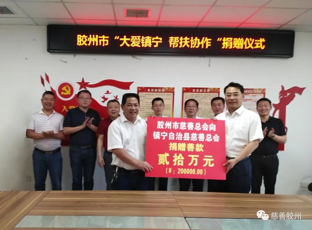 2020年 5月14日,膠州市慈善總會(huì)“大愛鎮(zhèn)寧·幫扶協(xié)作”慈善捐贈(zèng)儀式在貴州省鎮(zhèn)寧自治縣便民利民服務(wù)中心舉行。膠州市民政局局長、膠州市慈善總會(huì)副會(huì)長兼秘書長秦玉峰,貴州省鎮(zhèn)寧自治縣委常委、縣委政法委書記楊猛,貴州省鎮(zhèn)寧自治縣人民政府黨組成員、縣人民政府辦公室副主任、縣扶貧開發(fā)辦公室黨組成員、副主任王鐸,貴州省鎮(zhèn)寧自治縣民政局黨組書記、局長王虎舟,貴州省鎮(zhèn)寧自治縣退役軍人事務(wù)局局長、慈善總會(huì)副會(huì)長張?jiān)鳎F州省鎮(zhèn)寧自治縣衛(wèi)生健康局局長、慈善總會(huì)副會(huì)長張貴云,貴州省鎮(zhèn)寧自治縣紅十字會(huì)秘書長、慈善總會(huì)副會(huì)長羅才文出席捐贈(zèng)儀式。